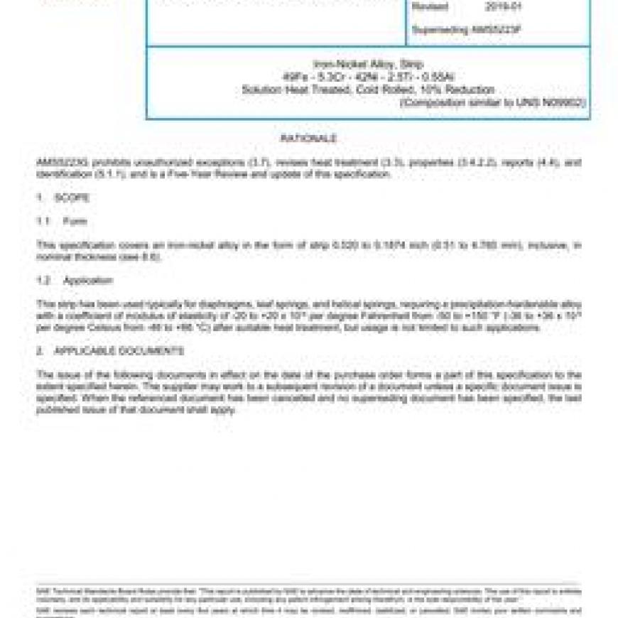 SAE AMS5223G Iron-Nickel Alloy, Strip 49Fe - 5.3Cr - 42Ni - 2.5Ti - 0.55Al Solution Heat Treated, Cold Rolled, 10% Reduction