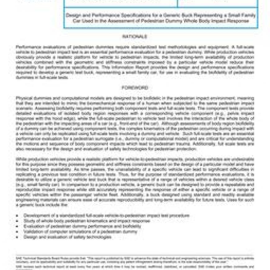 This Information Report addresses the design and performance specifications for a generic buck to be used in full-scale vehicle to pedestrian tests conducted to evaluate pedestrian dummy performance. Specifically, the buck is designed to mimic the impact response of the front end of a sedan within the small family car class during a collision with a pedestrian. The goal is to develop a generic buck with simplified geometry and a limited number of components made of clearly defined and readily available engineering materials to facilitate fabrication and reproducibility. To ensure performance of the buck, it is specified that the buck mimics the maximum crush distance, absorbed energy, and maximum force corresponding to a sedan within the small family car class during a pedestrian impact. The design and performance specifications provided in this document focus on: (1) the design specifications describing the materials and geometry of the generic buck and (2) the specific certification tests that are required to ensure that any fabricated buck meets the necessary design specifications.