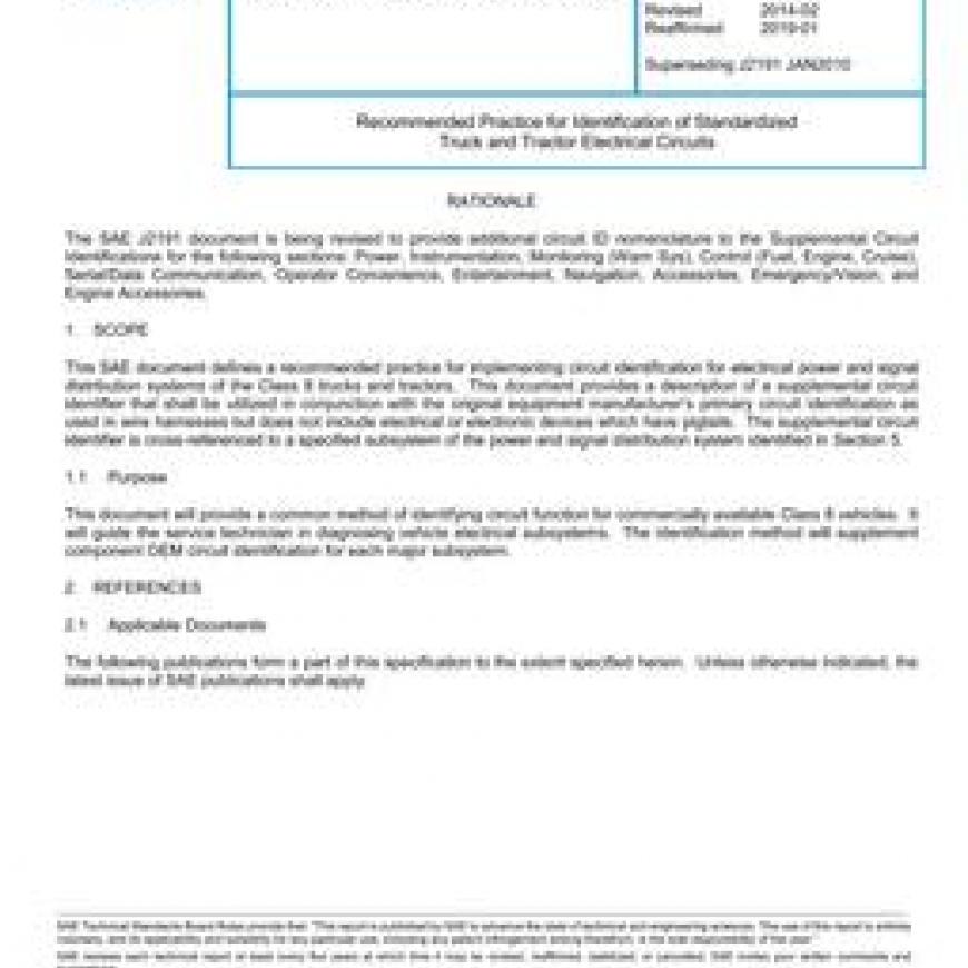 This SAE document defines a recommended practice for implementing circuit identification for electrical power and signal distribution systems of the Class 8 trucks and tractors. This document provides a description of a supplemental circuit identifier that shall be utilized in conjunction with the original equipment manufacturer¿¿¿s primary circuit identification as used in wire harnesses but does not include electrical or electronic devices which have pigtails. The supplemental circuit identifier is cross-referenced to a specified subsystem of the power and signal distribution system identified in Section 5.