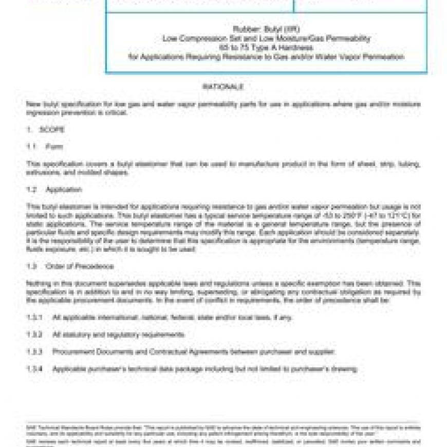 SAE AMS3941 Rubber: Butyl (IIR) Low Compression Set and Low Moisture/Gas Permeability 65 to 75 Type A Hardness for Applications Requiring Resistance to Gas and/or Water Vapor Permeation