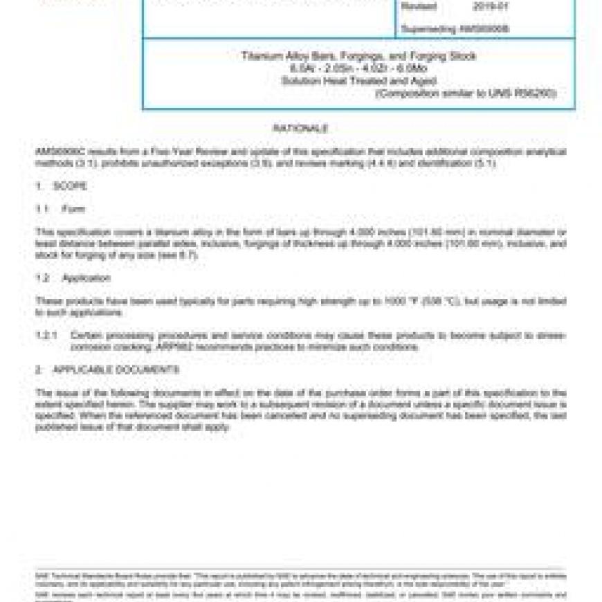 This specification covers a titanium alloy in the form of bars up through 4.000 inches (101.60 mm) in nominal diameter or least distance between parallel sides, inclusive, forgings of thickness up through 4.000 inches (101.60 mm), inclusive, and stock for forging of any size (see 8.7).