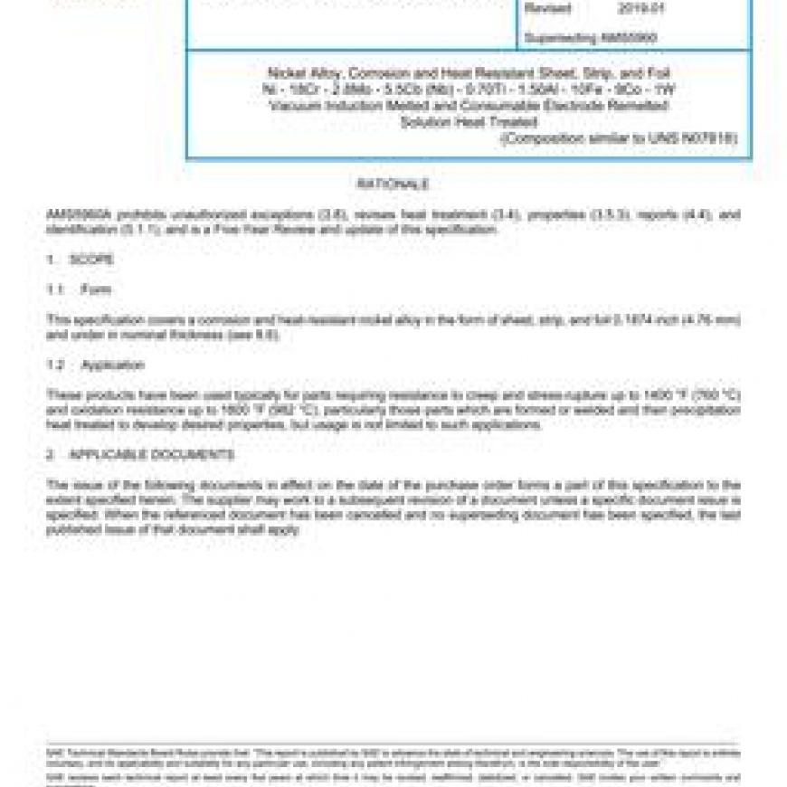 SAE AMS5960A Nickel Alloy, Corrosion and Heat Resistant Sheet, Strip, and Foil Ni - 18Cr - 2.8Mo - 5.5Cb (Nb) - 0.70Ti - 1.50Al - 10Fe - 9Co - 1W Vacuum Induction Melted and Consumable Electrode Remelted Solution Heat Treated