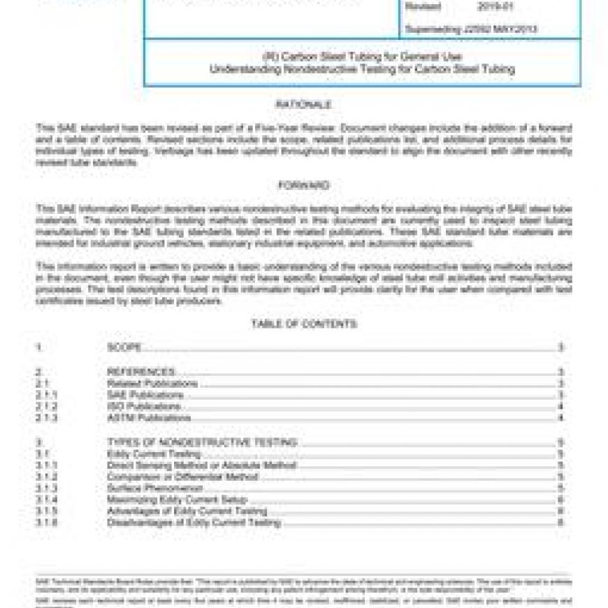 This Information Report describes eddy current testing, flux leakage testing, ultrasonic testing, and magnetic particle testing of steel tubing. The purpose of these testing methods is to expose flaws in the tube material or weld zone, such as discontinuities, seams, cracks, holes, voids, and other imperfections characteristic to the specific construction of the tubing. When agreed upon between the producer and purchaser, nondestructive testing is used in lieu of destructive hydrostatic pressure proof testing.Aircraft and Aerospace applications were not considered during the preparation of this document.