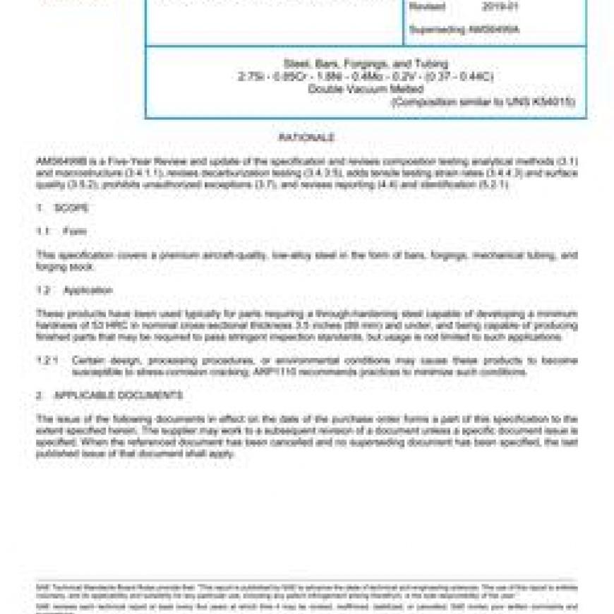 SAE AMS6499B Steel, Bars, Forgings, and Tubing 2.7Si - 0.85Cr - 1.8Ni - 0.4Mo - 0.2V - (0.37 - 0.44C) Double Vacuum Melted