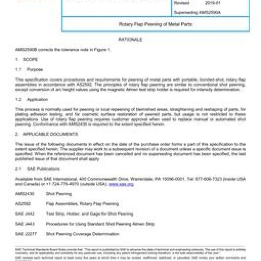 This specification covers procedures and requirements for peening of metal parts with portable, bonded-shot, rotary flap assemblies in accordance with AS2592. The principles of rotary flap peening are similar to conventional shot peening, except conversion of arc height values using the magnetic Almen test strip holder is required for intensity determination.