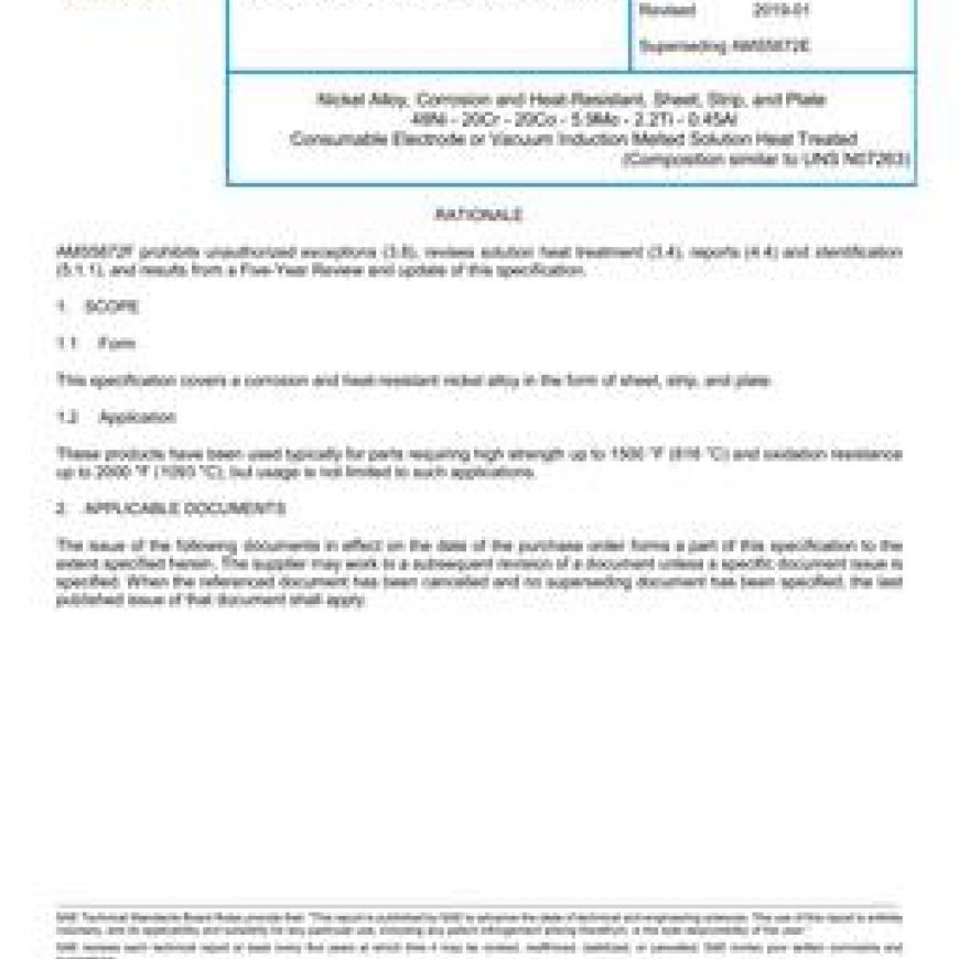 SAE AMS5872F Nickel Alloy, Corrosion and Heat-Resistant, Sheet, Strip, and Plate 48Ni - 20Cr - 20Co - 5.9Mo - 2.2Ti - 0.45Al Consumable Electrode or Vacuum Induction Melted Solution Heat Treated