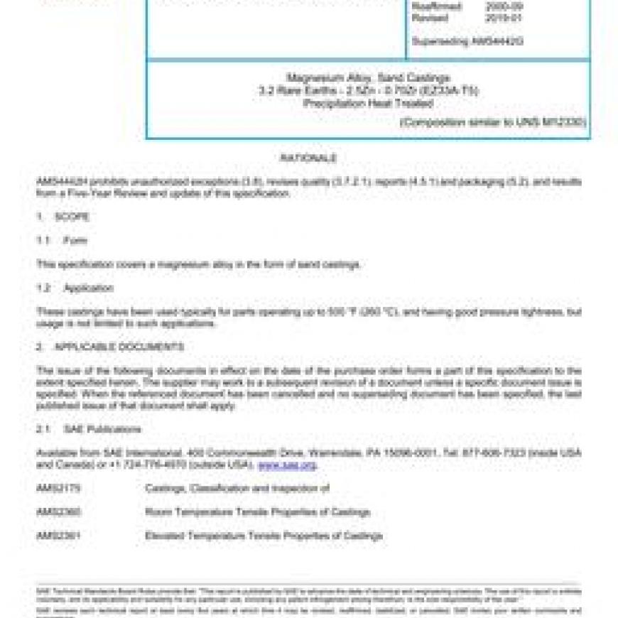 SAE AMS4442H Magnesium Alloy, Sand Castings 3.2 Rare Earths - 2.5Zn - 0.70Zr (EZ33A-T5) Precipitation Heat Treated