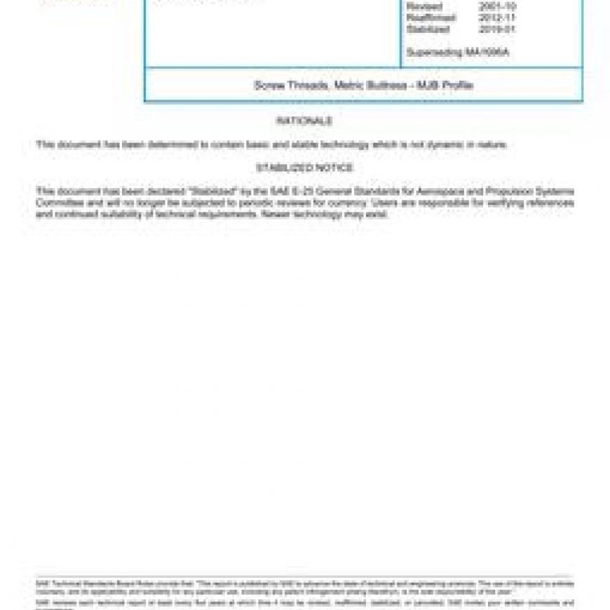 This standard establishes the basic triangular profile for the MJB thread form, the design profiles, standard pitches, tolerance classes, formulae for tolerances and dimensions, tolerance tables, and a system of designations. Because of the specialized application for buttress threads, no preferred diameter-pitch series have been established for this standard and each application will require use of the thread formulae for dimensions and related tolerances given herein for deriving the thread dimensional requirements.