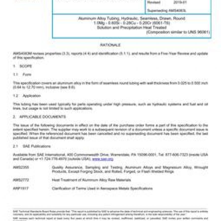 SAE AMS4083M Aluminum Alloy Tubing, Hydraulic, Seamless, Drawn, Round 1.0Mg - 0.60Si - 0.28Cu - 0.20Cr (6061-T6) Solution and Precipitation Heat Treated
