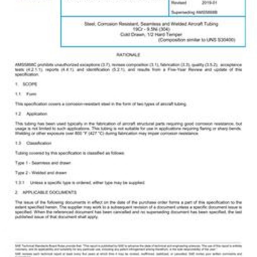 SAE AMS5868C Steel, Corrosion Resistant, Seamless and Welded Aircraft Tubing 19Cr - 9.5Ni (304) Cold Drawn, 1/2 Hard Temper