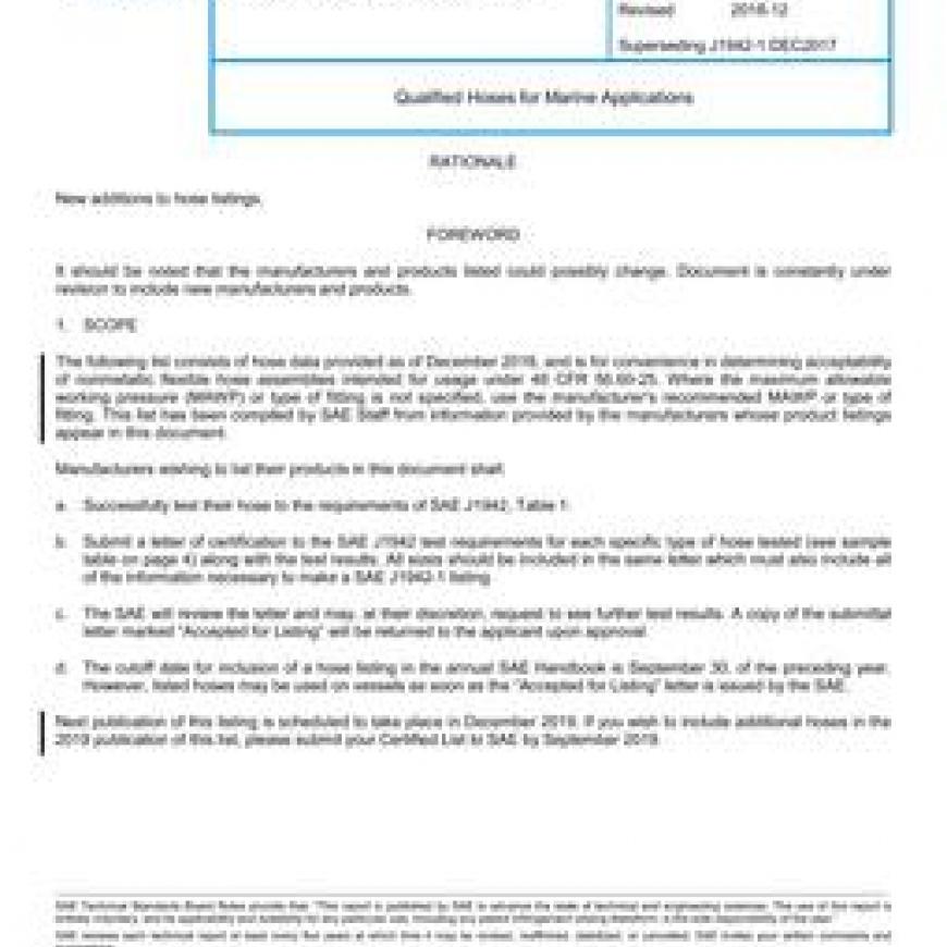 d The cutoff date for inclusion of a hose listing in the annual SAE Handbook is September 30, of the preceding year. However, listed hoses may be used on vessels as soon as the ¿¿¿Accepted for Listing¿¿¿ letter is issued by the SAE. Next publication of this listing is scheduled to take place in December 2019. If you wish to include additional hoses in the 2019 publication of this list, please submit your Certified List to SAE by September 2019.