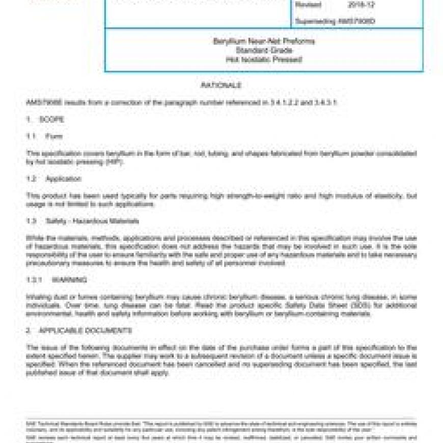 SAE AMS7908E Beryllium Near-Net Preforms Standard Grade Hot Isostatic Pressed