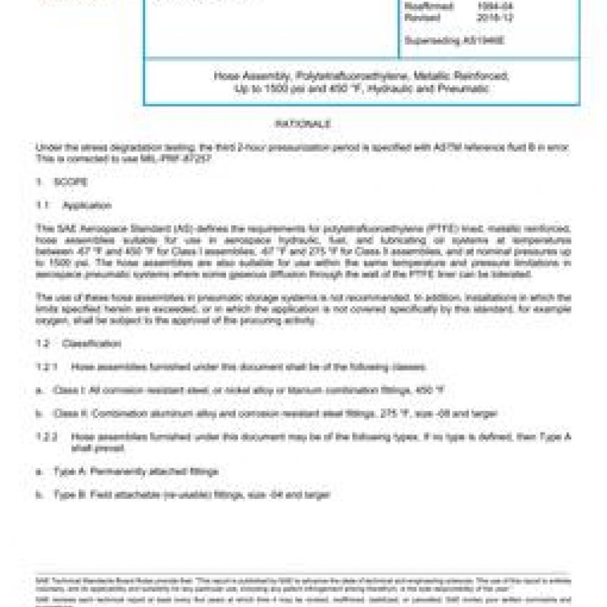 This SAE Aerospace Standard (AS) defines the requirements for polytetrafluoroethylene (PTFE) lined, metallic reinforced, hose assemblies suitable for use in aerospace hydraulic, fuel, and lubricating oil systems at temperatures between -67 degrees F and 450 degrees F for Class I assemblies, -67 degrees F and 275 degrees F for Class II assemblies, and at nominal pressures up to 1500 psi. The hose assemblies are also suitable for use within the same temperature and pressure limitations in aerospace pneumatic systems where some gaseous diffusion through the wall of the PTFE liner can be tolerated.The use of these hose assemblies in pneumatic storage systems is not recommended. In addition, installations in which the limits specified herein are exceeded, or in which the application is not covered specifically by this standard, for example oxygen, shall be subject to the approval of the procuring activity.