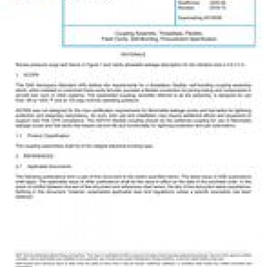 This SAE Aerospace Standard (AS) defines the requirements for a threadless, flexible, self-bonding coupling assembly which, when installed on machined fixed-cavity ferrules, provides a flexible connection for joining tubing and components in aircraft fuel, vent, or other systems. This assembled coupling, hereafter referred to as the assembly, is designed for use from -65 to +400 Degrees F and at 125 psig nominal operating pressure. AS1650 was not designed for the new certification requirements for flammable leakage zones and fuel tanks for lightning protection and assembly redundancy. As such, their use and installation may require additional efforts and equipment to support new FAA CFR compliance. The AS7510 flexible coupling should be the preferred coupling for use in flammable leakage zones and fuel tanks that require service life and functionality for lightning protection and part redundancy.