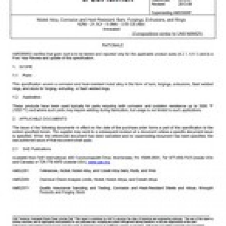 This specification covers a corrosion and heat resistant nickel alloy in the form of bars, forgings, extrusions, flash welded rings, and stock for forging or flash welded rings.These products have been used for parts requiring both corrosion and oxidation resistance up to 2000 degrees F (1093 degrees C) and where such parts may require welding during fabrication, but usage is not limited to such applications.