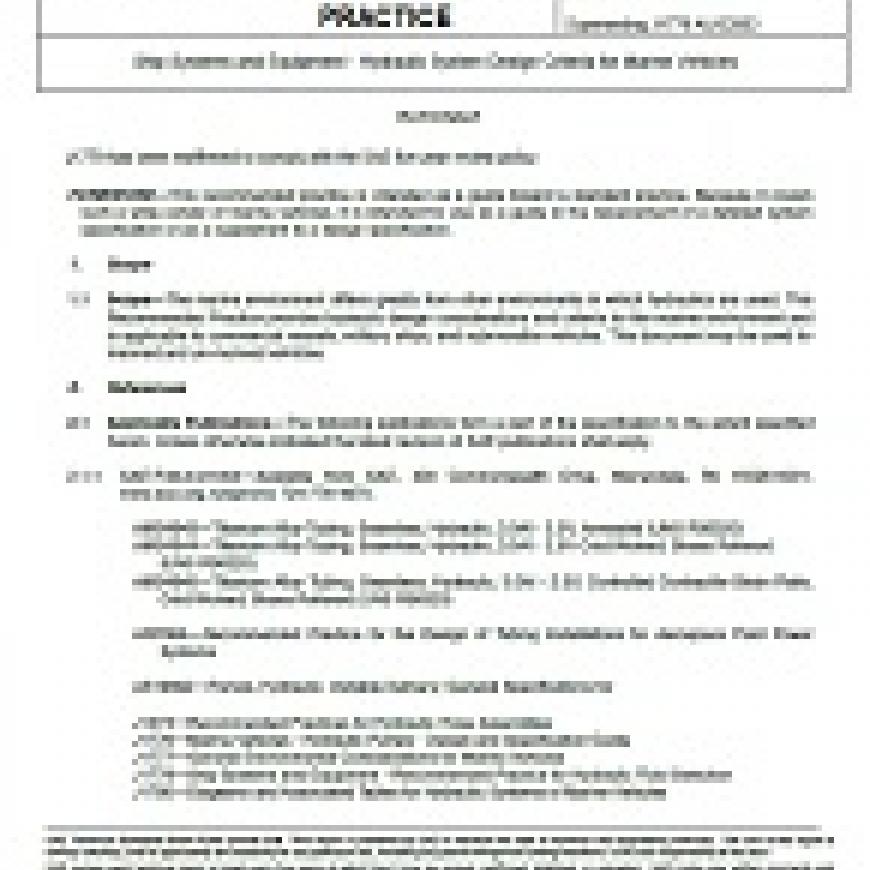 The marine environment differs greatly from other environments in which hydraulics are used. This Recommended Practice provides hydraulic design considerations and criteria for the marine environment and is applicable to commercial vessels, military ships, and submersible vehicles. This document may be used for manned and un-manned vehicles.