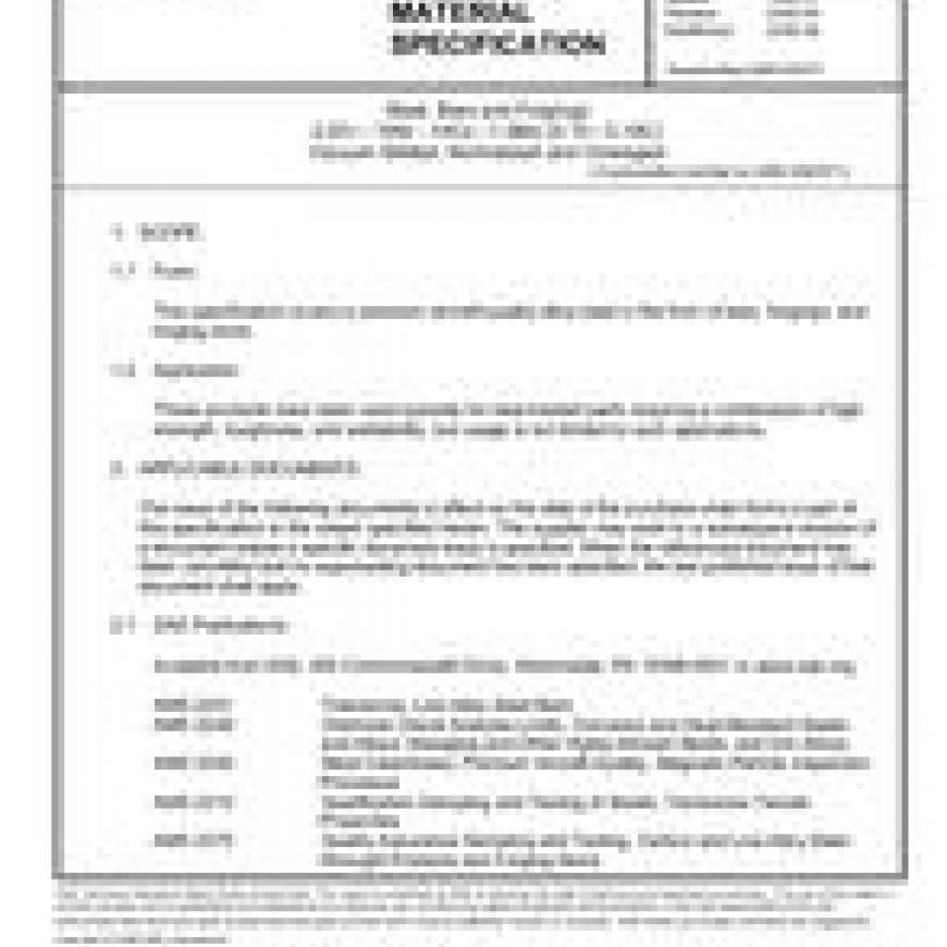 This specification covers a premium aircraft-quality alloy steel in the form of bars, forgings, mechanical turbing, flash welded rings, and stock for forgning or flash welded rings.These products have been used typically for parts requiring through-hardening, without liquid quenching, to a yield strength of 270 ksi (1862 MPa) and higher and where such parts may require welding during fabrication, but usage is not limited to such applications.