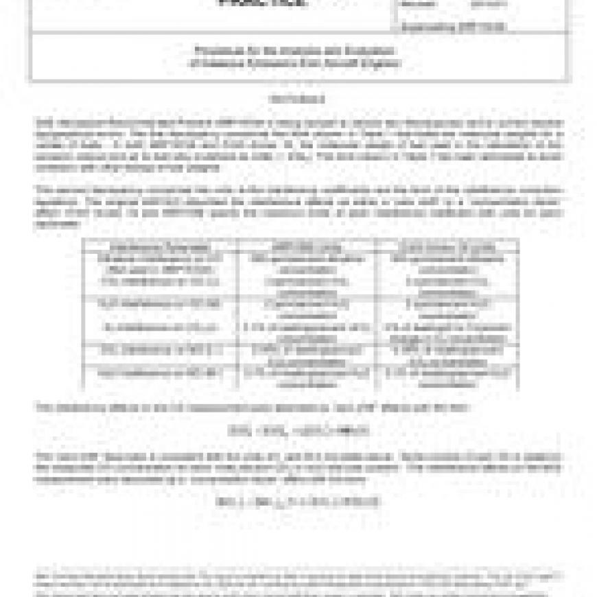 Aerospace Recommended Practice (ARP) 1533 is a procedure for the analysis and evaluation of the measured composition of the exhasut gas from aircraft engines. Measurements of carbon monoxide, carbon dioxide, total hydrocarbon, and the oxides of nitrogen are used to deduce emission indices, fuel-air ratio, combustion efficiency, and exhaust gas thermodynamic properties. The emission indices (EI) are the parameters of critical interest to the engine developers and the atmospheric emissions regulatory agencies because they relate engine performance to environmental impact.