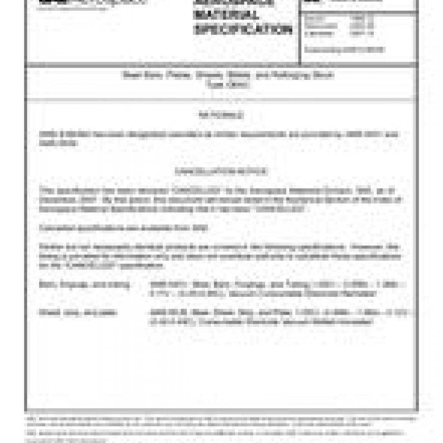 This specification has been declared CANCELLED by the Aerospace Materials Division, SAE, as of December, 2007. By this action, this document will remain listed in the Numerical Section of the Index of Aerospace Material Specifications indicating that it has been CANCELLED. Cancelled specifications are available from SAE. Similar but not necessarily identical products are covered in the following specifications. However, this listing is provided for information only and does not constitute authority to substitute these specifications for the CANCELLED specification.Bars, forgings, and tubing SAE AMS 6431, Steel, Bars, Forgings, and Tubing,1.05Cr 0.55Ni 1.0Mo 0.11V (0.45-0.50C), Vacuum Consumable Electrode RemeltedSheet, strip, and plate SAE AMS 6439, Steel, Sheet, Strip, and Plate, 1.05Cr 0.55Ni 1.0Mo 0.12V (0.42-0.48C), Consumable Electrode Vacuum Melted AnnealedThis specification establishes the requirements for procuring vacuum melted Cr-Mo-V-Ni, type D6AC steel forged billets, reforging stock, bars, rods, plate, sheet, and strip.