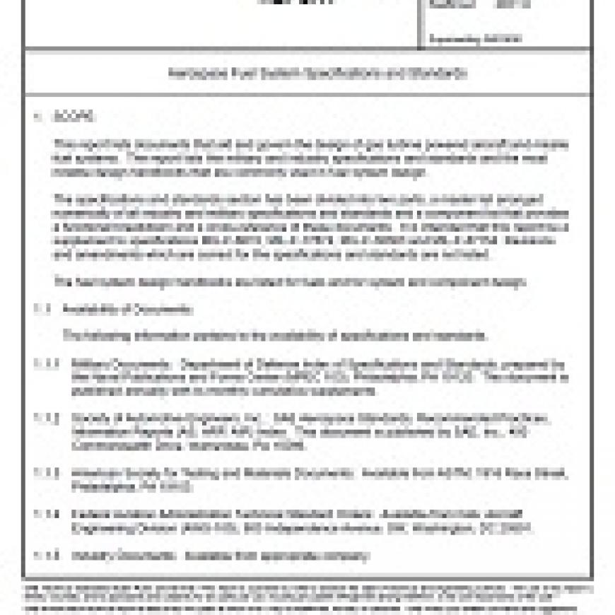 This report lists documents that aid and govern the design of gas turbine powered aircraft and missile fuel systems. The report lists the military and industry specifications and standards and the most notable design handbooks that are commonly used in fuel system design. The specifications and standards section has been divided into two parts, a master list arranged numerically of all industry and military specifications and standards and a component list that provides a functional breakdown and a cross-reference of these documents. It is intended that this report be a supplement to specifications MIL-F-8615; MIL-F-17874; MIL-F-38363 and MIL-F-87154. Revisions and amendments which are correct for the specifications and standards are not listed. The fuel system design handbooks are listed for fuels and for system and component design.