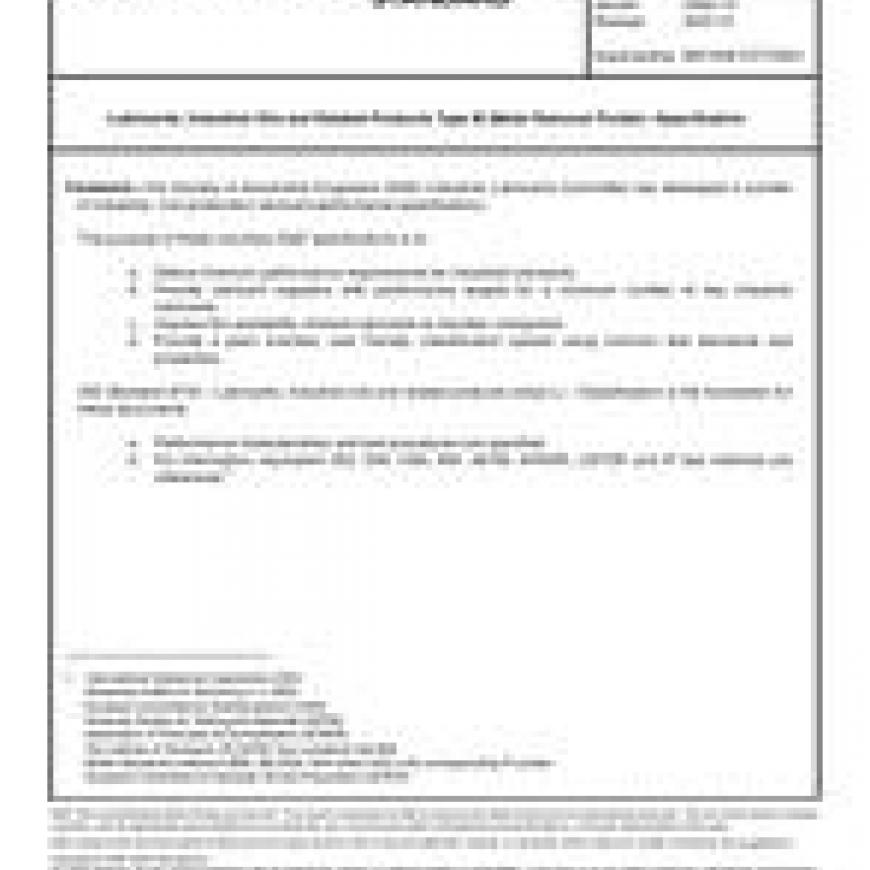 The Society of Automotive Engineers (SAE) Industrial Lubricants Committee has developed a number of industrial, non-production lubricant performance specifications. The purpose of these voluntary SAE specifications is to: a. Define minimum performance requirements for industrial lubricants. b. Provide lubricant suppliers with performance targets for a minimum number of key industrial lubricants. c. Improve the availability of these lubricants to member companies. d. Provide a plant oriented, user friendly, classification system using common test standards and properties. ISO Standard 6743 - Lubricants, industrial oils and related products (class L) - Classification is the foundation for these documents. Performance characteristics and test procedures are specified. For information, equivalent ISO, DIN, CEN, BSI, ASTM, AFNOR, CETOP, and IP test methods are referenced.
